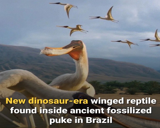 - Scientists discovered a new flying reptile species, Bakiribu waridza, from a 100-million-year-old fossilised regurgitate (dinosaur vomit).