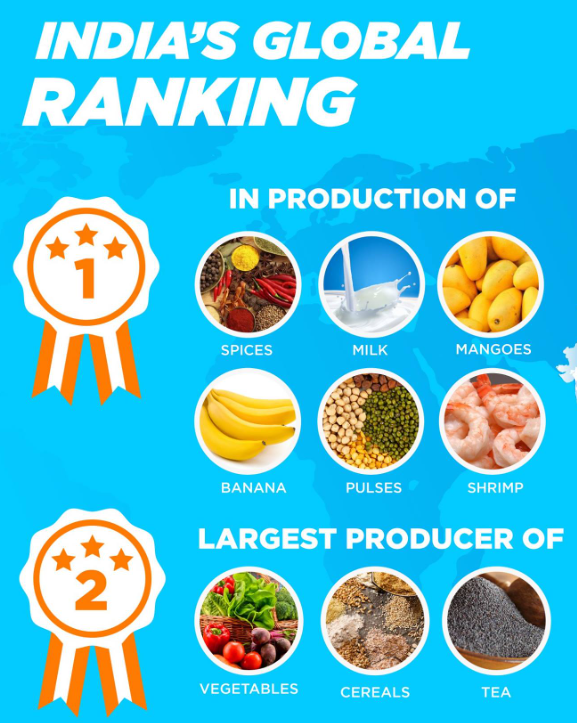 India leads in milk and millet production, and ranks second in fruits, vegetables, and fish output.