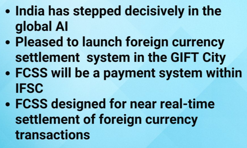 - The finance minister launched a foreign currency settlement system (FCSS) in GIFT City, Gujarat.