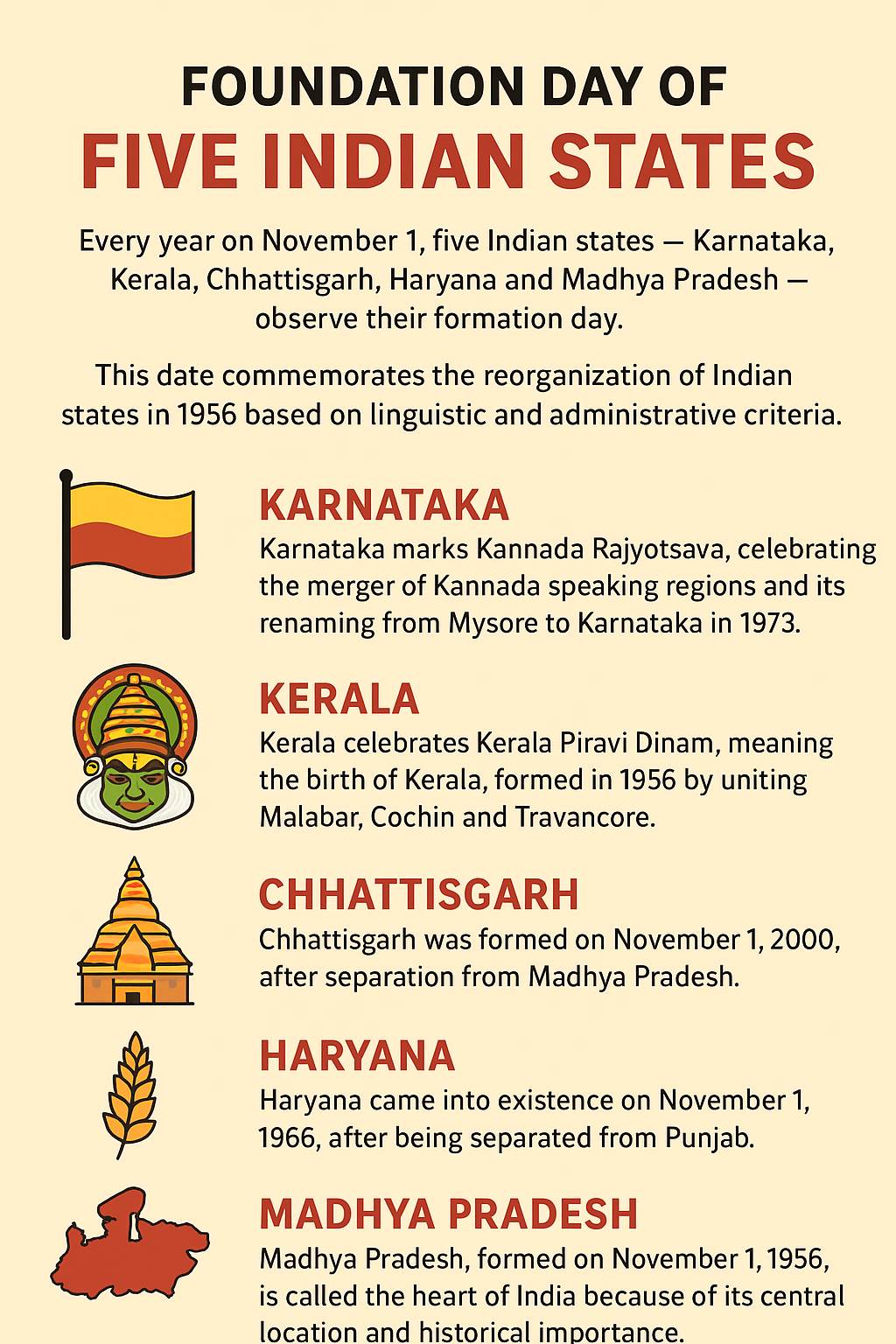 - Every year on November 1, five Indian states — Karnataka, Kerala, Chhattisgarh, Haryana and Madhya Pradesh — observe their formation day.