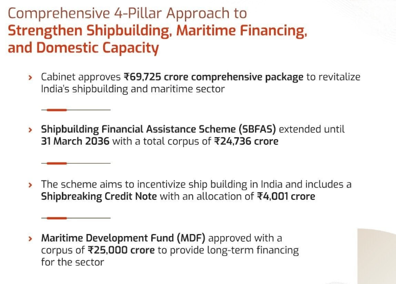 The Cabinet has approved a comprehensive four-pillar strategy to revitalize India’s shipbuilding and maritime sector.