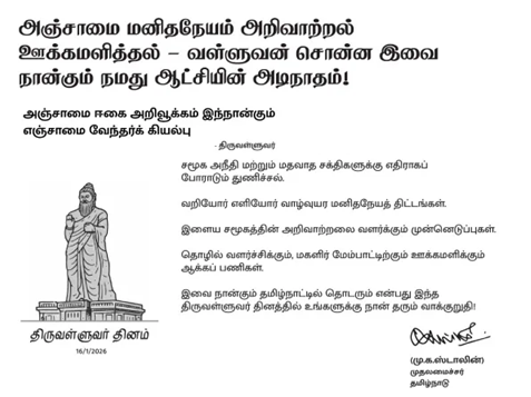 On the occasion of Thiruvalluvar Day, TN Chief Minister MK Stalin, said four principles articulated by Thiruvalluvar are the very foundations of his governance and he would continue to uphold them in TN.