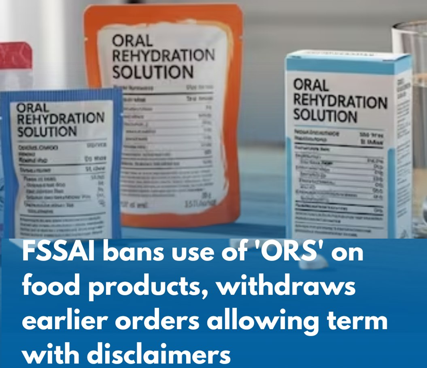 • The Food Safety and Standards Authority of India (FSSAI) prohibited the use of the term "ORS" (Oral Rehydration Solution) in the branding of beverages.