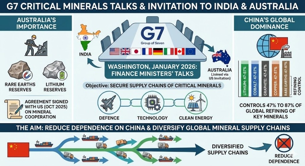 - The United States (US) invited India and Australia to join the G7 finance ministers’ talks on critical minerals in Washington in January 2026.