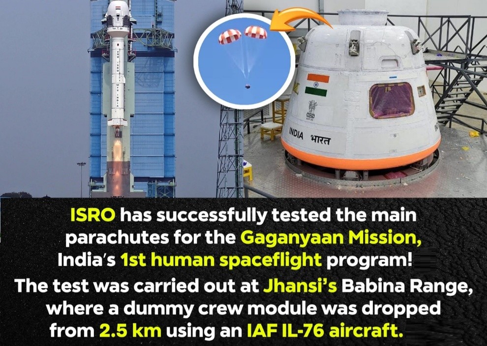 - ISRO conducted a key test of the main parachutes for the Gaganyaan Crew Module at the Babina Field Firing Range in Uttar Pradesh.