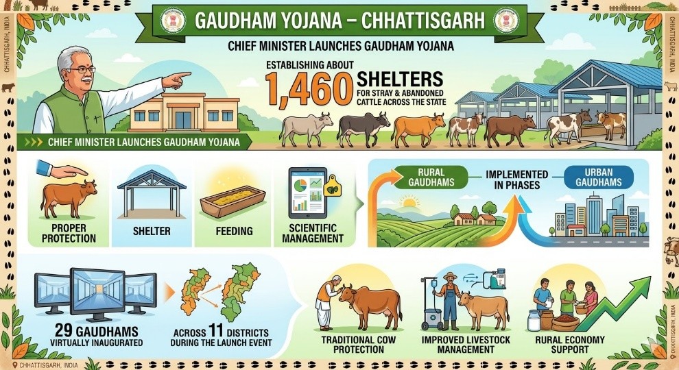 - The Chief Minister of Chhattisgarh has launched the Gaudham Yojana to establish about 1,460 shelters for stray and abandoned cattle across the state.