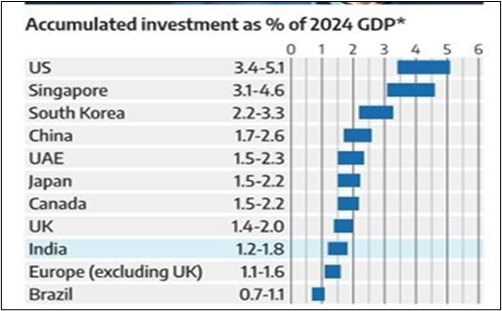 India invested about 1.2%–1.8% of its 2024 GDP in AI during 2010–2024.