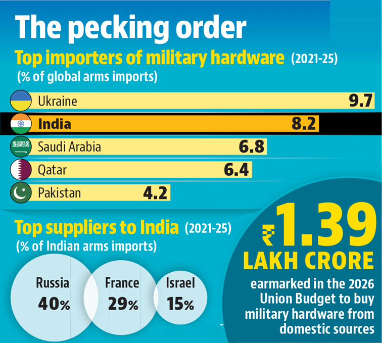 - Stockholm International Peace Research Institute reported that India ranked second in global arms imports during 2021–2025.