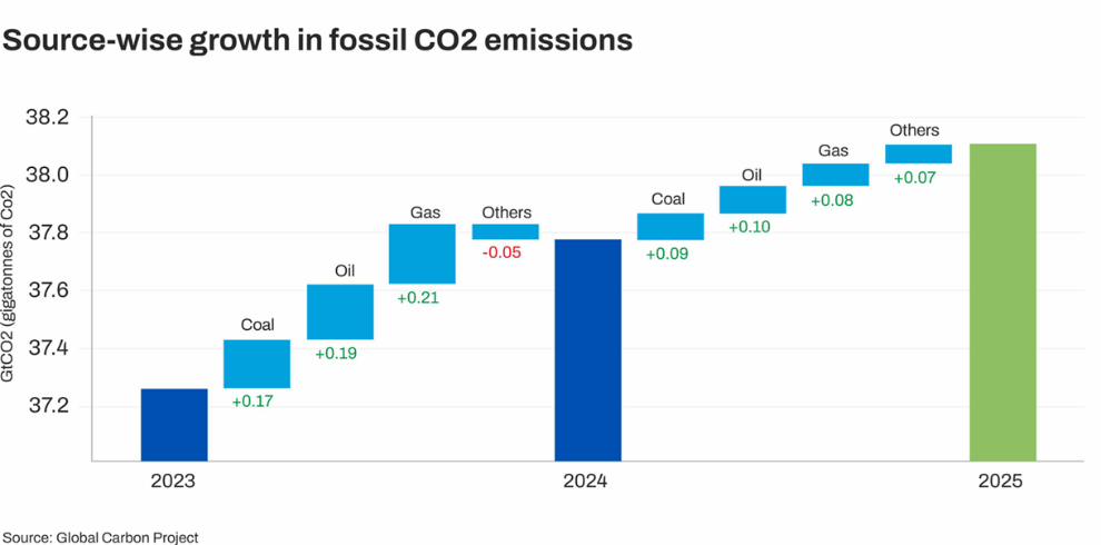 - Global fossil fuel carbon dioxide emissions are projected to rise by 1.1% in 2025, reaching a record 38.1 billion tonnes.