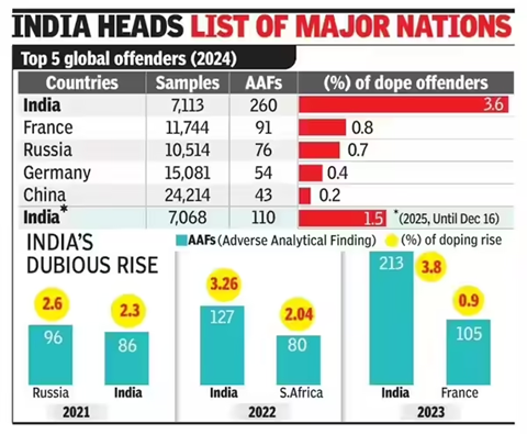 - The World Anti-Doping Agency (WADA) reported 260 doping cases involving Indian athletes in 2024.