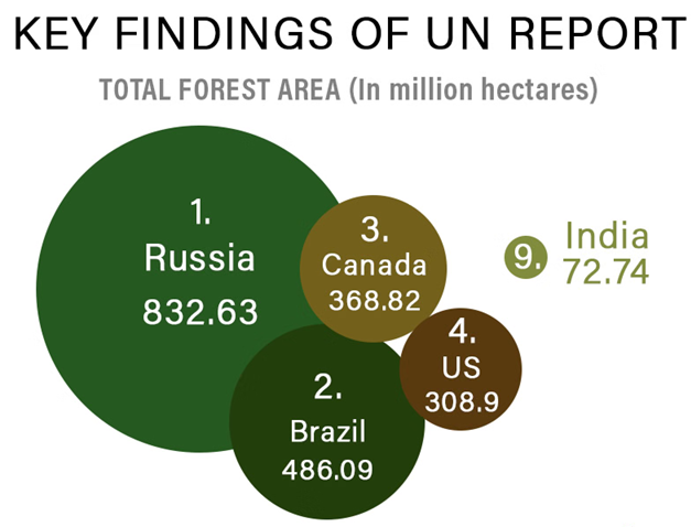 - Globally, Russia has the largest forest cover at 832.6 million hectares, followed by Brazil, Canada, the United States, and China.