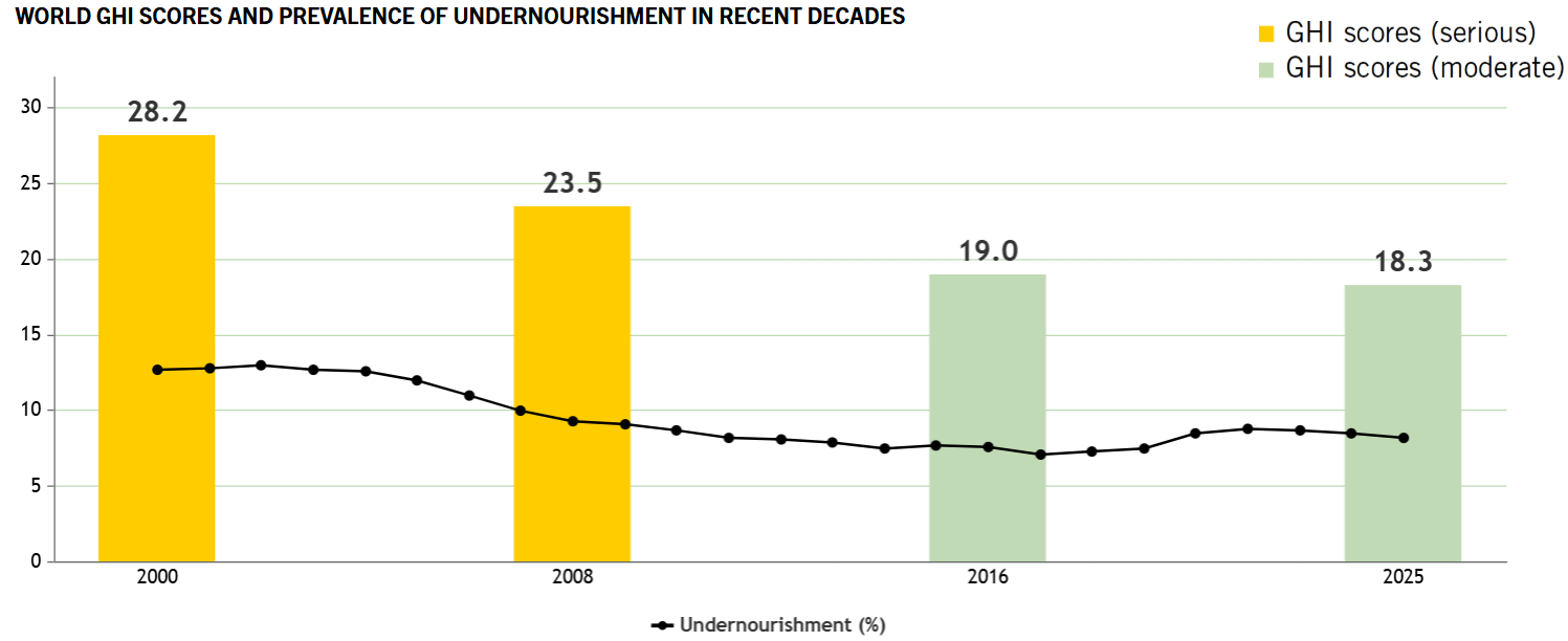 - The global GHI score in 2025 stands at 18.3, a marginal improvement from 19.0 in 2016, placing it in the ‘moderate’ category.