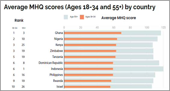 - India ranked 60th globally among the 18–34 age group with an MHQ score of 33 (global average: 66).
