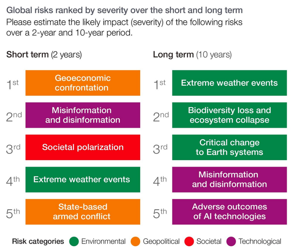 - Global risks in 2026 include armed conflicts, extreme weather, climate change, technological threats, and cyber insecurity.