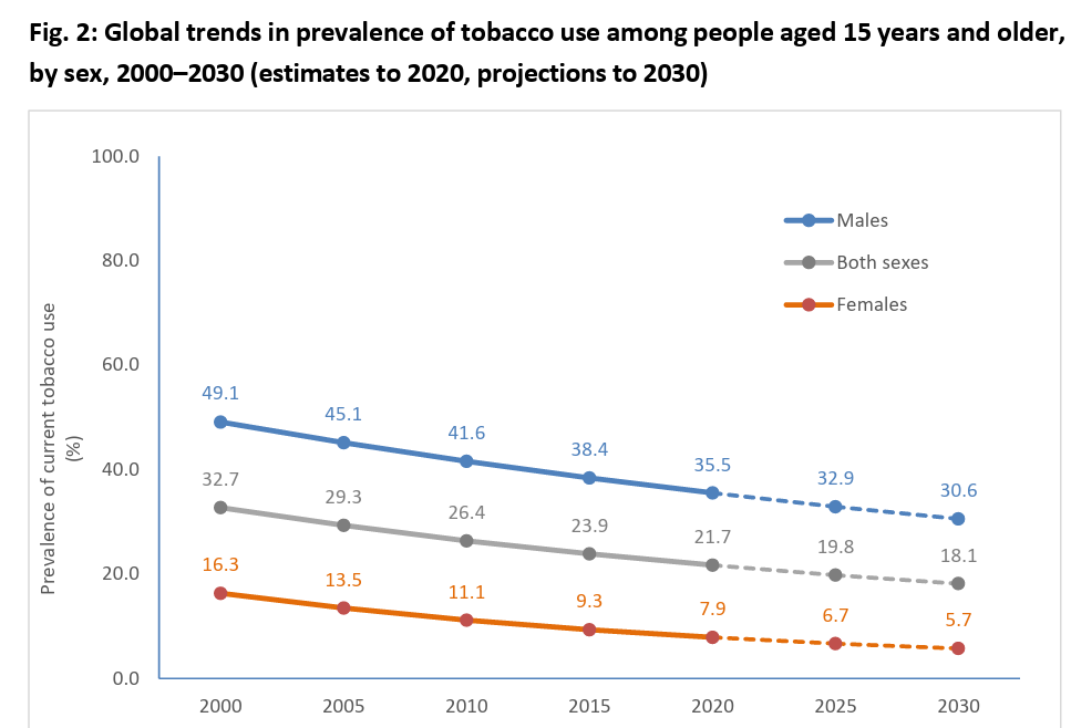 - Global tobacco users declined from 1.38 billion in 2000 to 1.2 billion in 2024.