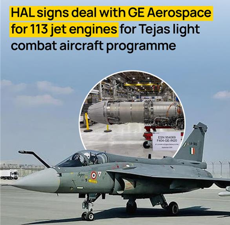 - Hindustan Aeronautics Limited (HAL) signed a $1-billion deal with GE Aerospace for 113 jet engines.