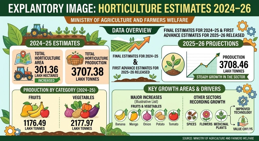 - Total horticulture area increased to 301.36 lakh hectares and production reached 3707.38 lakh tonnes in 2024–25.