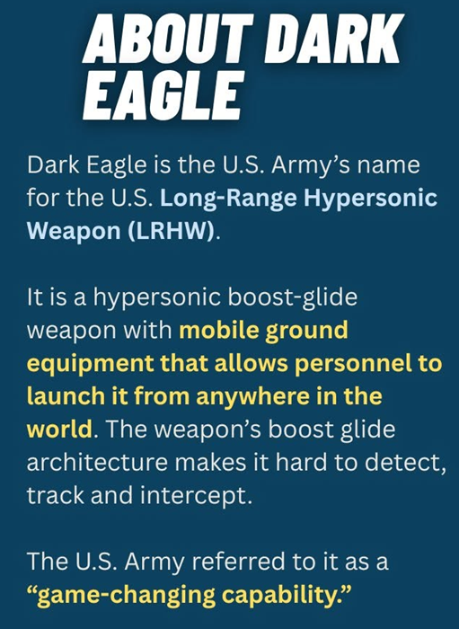 - Dark Eagle is a hypersonic missile system developed by the USA.