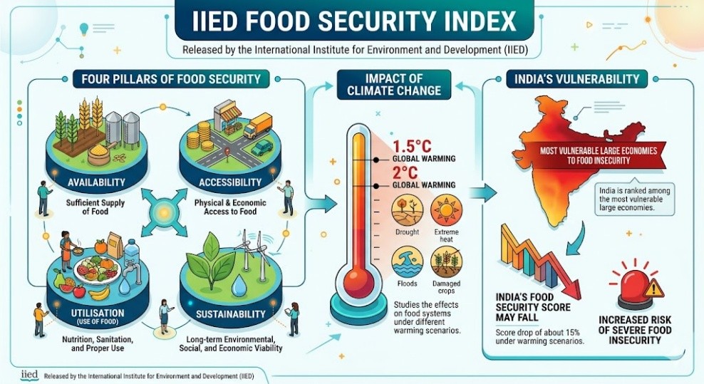 - India’s food security score may fall by about 15% under warming scenarios, increasing the risk of severe food insecurity.