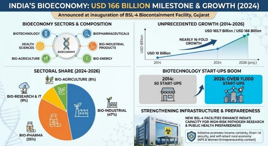 • India’s bioeconomy reached USD 166 billion in 2024, as announced during the inauguration of a Biosafety Level-4 (BSL-4) biocontainment facility in Gujarat.
