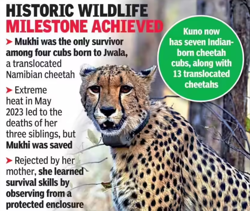 - Mukhi, an India-born female cheetah, will become the first to reach adulthood at Kuno National Park.