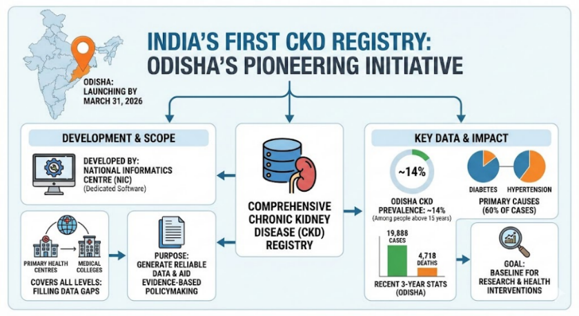 - Odisha will become the first Indian state to launch a comprehensive chronic kidney disease (CKD) registry by March 31, 2026.