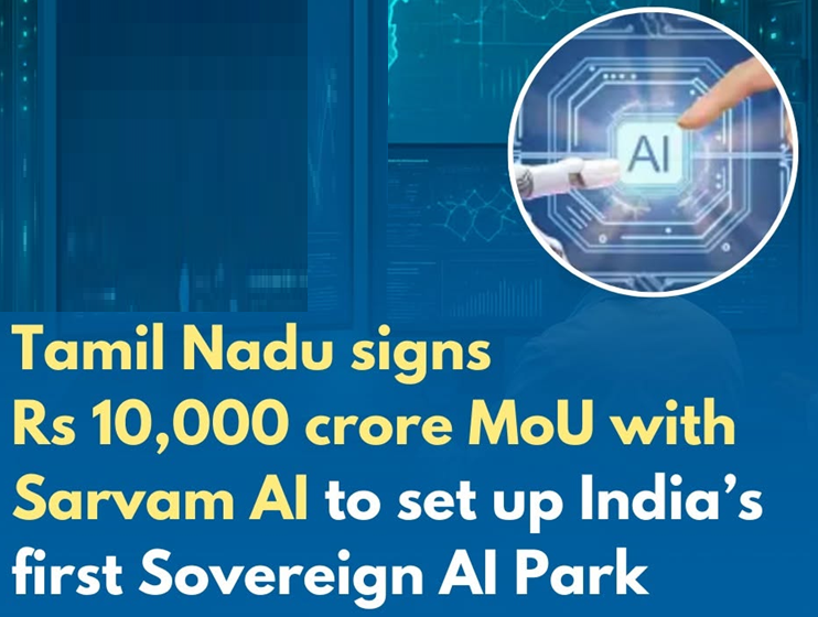 The Government of Tamil Nadu signed a MoU with Sarvam AI to set up India’s first ₹10,000-crore Sovereign Artificial Intelligence (AI) Park.