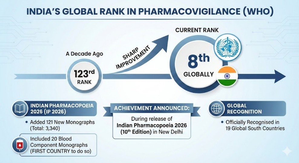 - India ranked 8th globally in contributions to pharmacovigilance (drug safety monitoring) under the WHO.