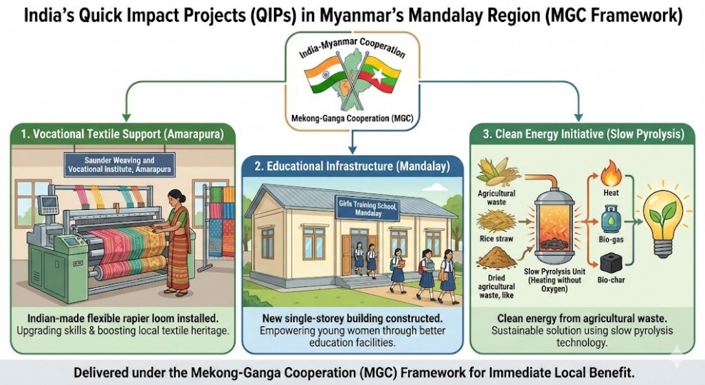 - India handed over three Quick Impact Projects (QIPs) to Myanmar’s Mandalay Region.