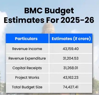 - For FY 2025–26, the BMC has proposed a budget of Rs 74,427 crore, its highest ever.