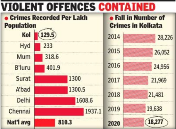 - Kolkata’s crime rate fell from 103.5 in 2021 to 83.9 in 2023.