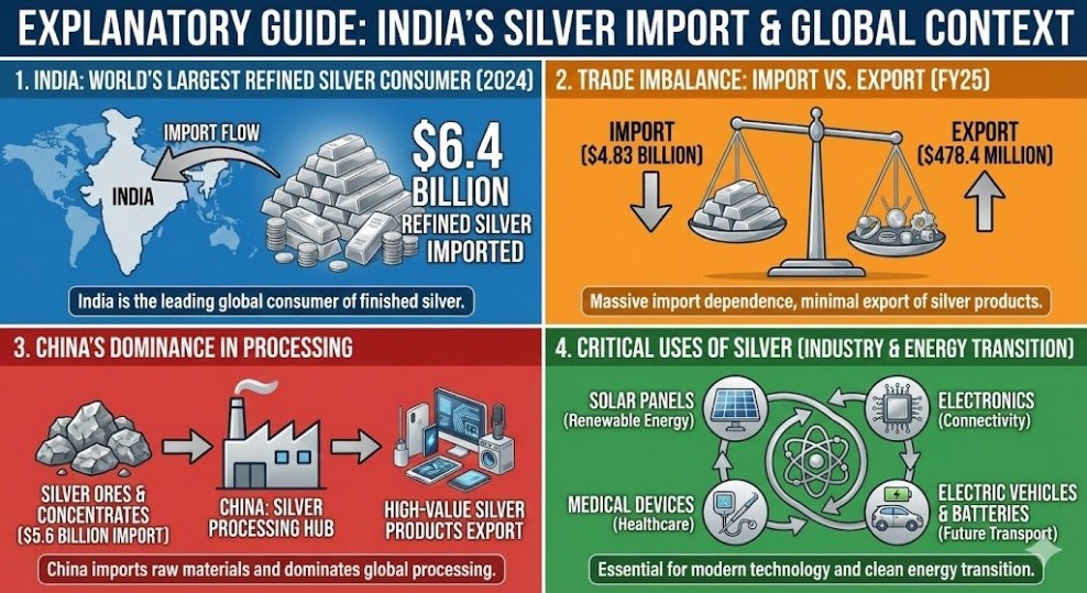 - In FY25, India exported only $478.4 million of silver products while importing $4.83 billion.