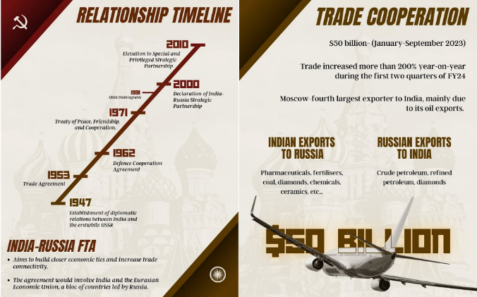 - India and Russia cooperate in key areas including energy, defence, nuclear technology, space, and pharmaceuticals.