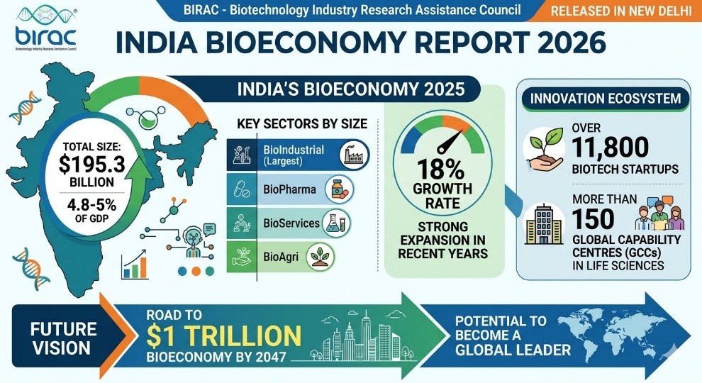 - The Biotechnology Industry Research Assistance Council (BIRAC) released the India BioEconomy Report (IBER) 2026 in New Delhi.