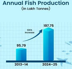 Fish production increased from 141.64 lakh tonnes (2019–20) to 197.75 lakh tonnes (2024–25).