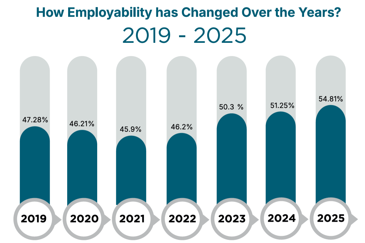India’s employability increased to 56.35% in the India Skills Report 2026, up from 54.81% last year.