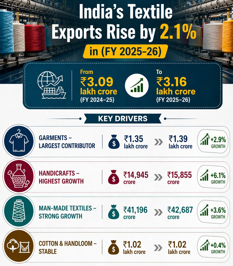 • India’s textile exports increased by 2.1% to 3.16 lakh crore in FY 202526.