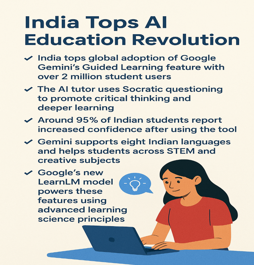 - India tops global adoption of Google Gemini’s Guided Learning feature with over 2 million student users.