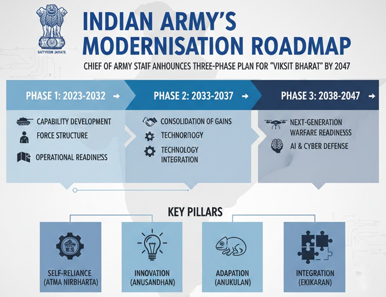 • Chief of Army Staff General announced a three-phase roadmap to transform the Indian Army into a fully integrated, future-ready force by 2047.