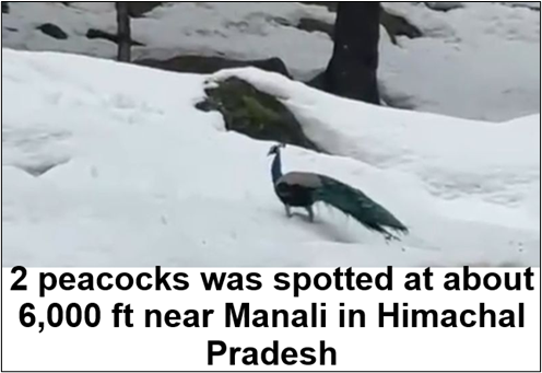 - A pair of peacocks was spotted at about 6,000 ft near Manali in Himachal Pradesh, which is unusual for this species.