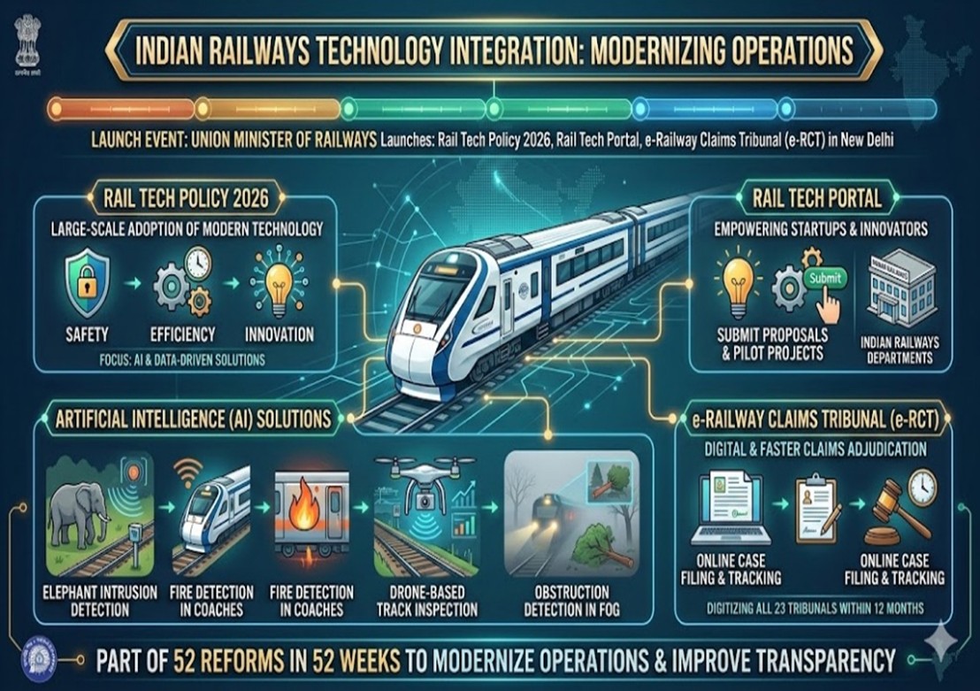 - The Rail Tech Policy 2026 promotes large-scale adoption of modern technology across Indian Railways.
