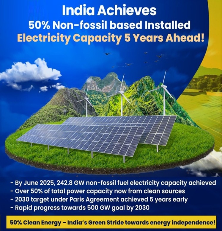 - India is reaching 50% of its installed electricity capacity from non-fossil fuel sources, five years ahead of the 2030 target.