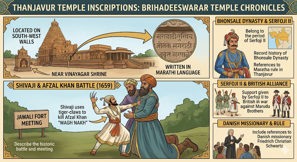- Inscriptions at the Brahadeeshwarar Temple describe the historic battle between Shivaji and Afzal Khan.