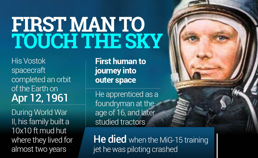 - On 12 April 1961, Yuri Gagarin of the Soviet Union became the first human to travel into space and orbit Earth.