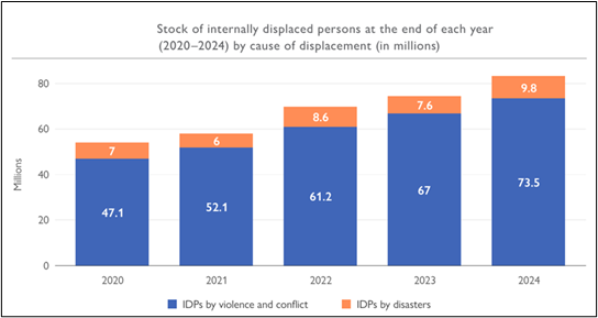 - Internal displacement reached 83.4 million people in 2024, the highest ever recorded globally.