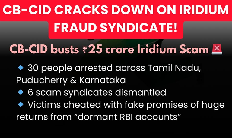 - The Crime Branch–Criminal Investigation Department (CB-CID), Tamil Nadu, arrested 57 persons in connection with the Iridium scam.