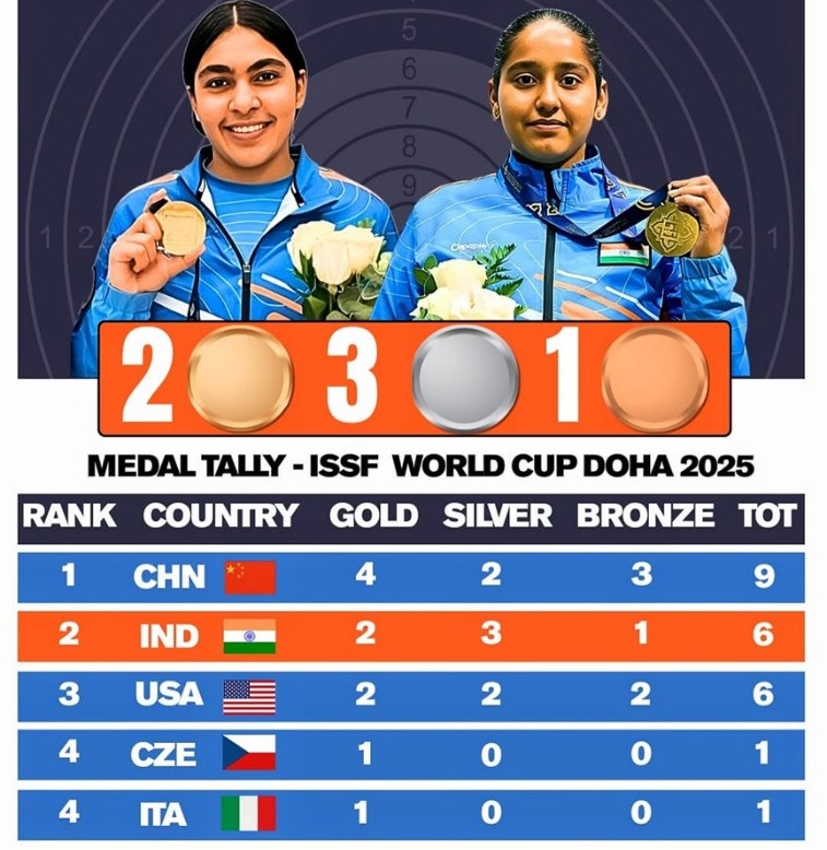 - India won six medals at the 2025 ISSF (International Shooting Sport Federation) World Cup Final in Doha, Qatar.
