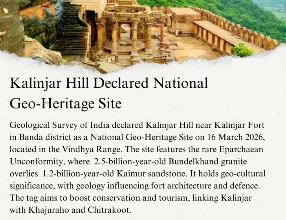 Kalinjar Hill was declared a National Geo-Heritage Site by Geological Survey of India.