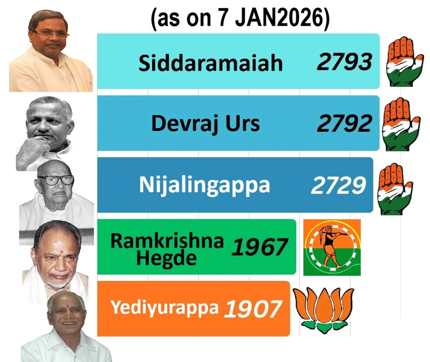 - Siddaramaiah became the longest-serving CM of Karnataka on January 7, 2026, by surpassing the tenure of D. Devaraj Urs.