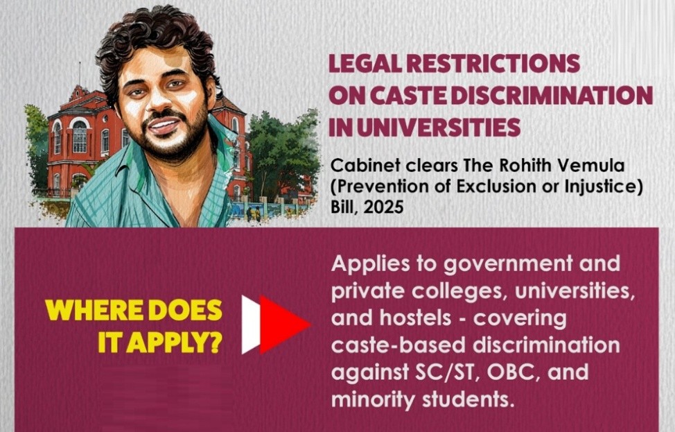 - Karnataka Cabinet approved the Rohith Vemula (Prevention of Discrimination, Exclusion or Injustice) (Right to Education and Dignity) Bill, 2026.